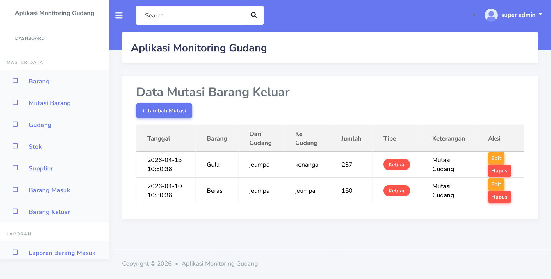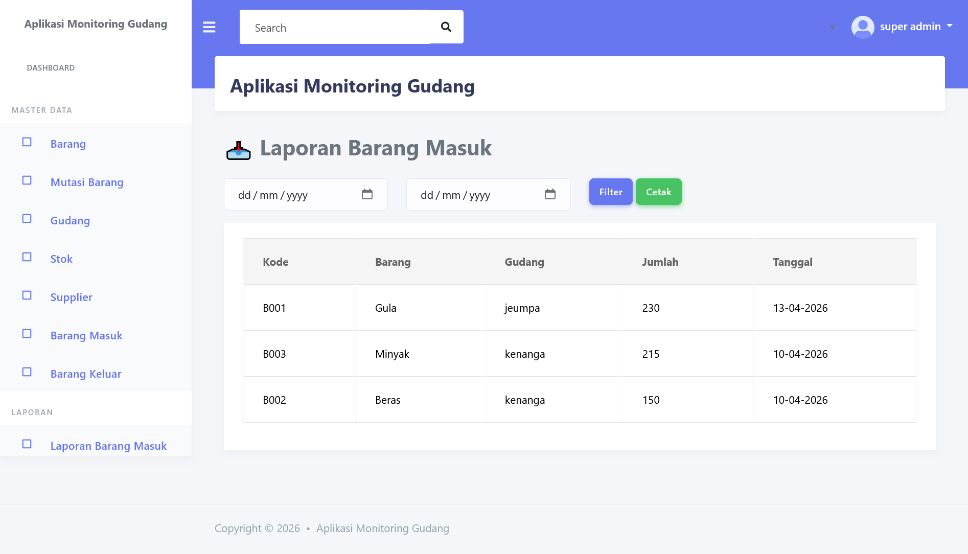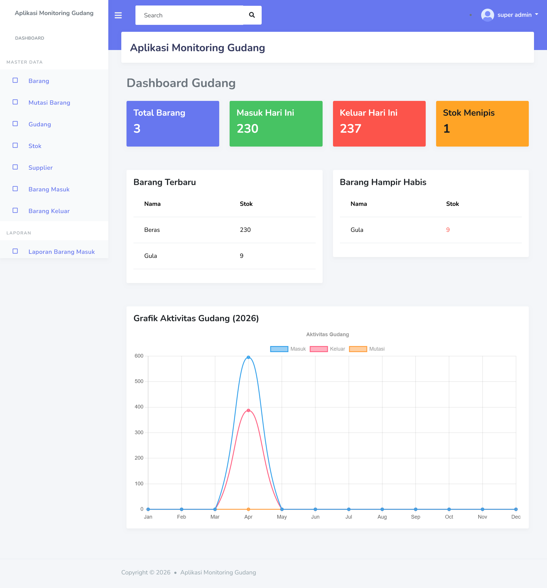 Sistem digital untuk memantau stok barang, aktivitas gudang, dan laporan inventori secara real-time.